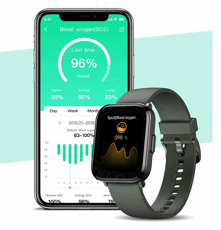Type: smart watch, features: water resistant, OS compatible: Android, iOS, measurements: calorie monitoring, sleep monitoring, physical activity monitoring, continuous heart rate measurement, blood oxygen level, heart rate monitor