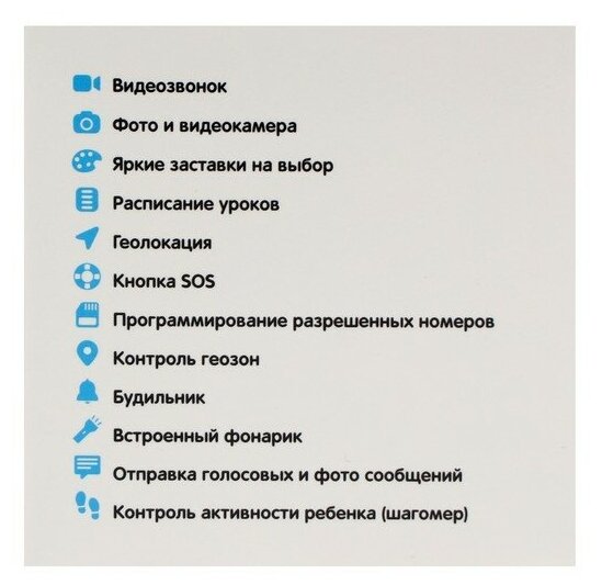 Video calls, voice messages, SOS button, location tracking, movement history, out of bounds notification, remote listening, translator, alarm clock, pedometer