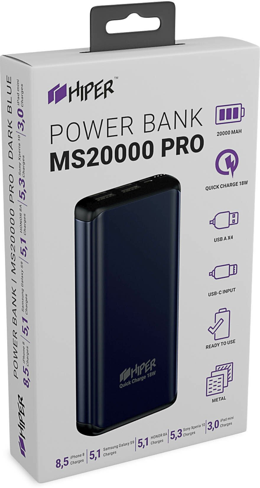 External HIPER MS20000 Li-Pol 20000 mAh Aluminum 2.4A+1.5A 4xUSB 1xType-C silver