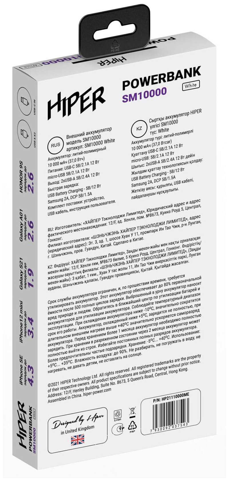 Capacity: 10000 mAh, compatibility: phone, tablet, portable devices, max. output current: 2.10 A, weight: 215 g