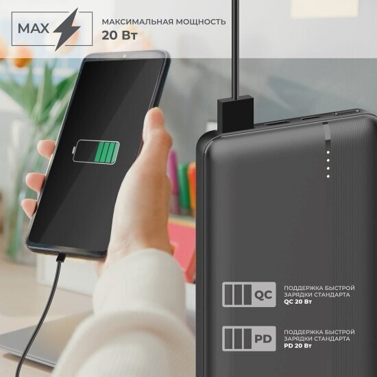 Capacity: 10000 mAh, compatibility: phone, laptop, tablet, portable devices, max. output current: 3A, features: Quick Charge, weight: 220g