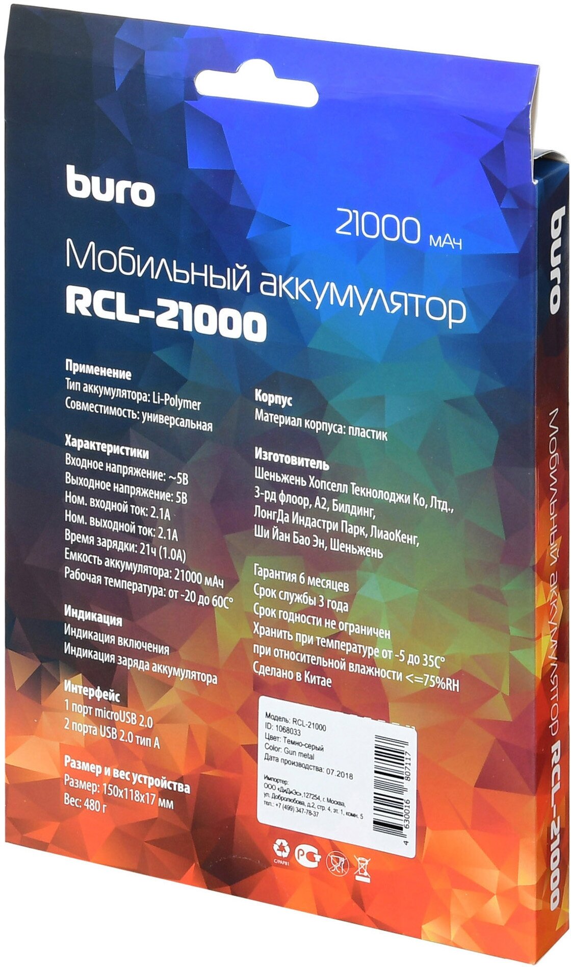 Capacity: 21000 mAh, max. output current: 2.10 A, weight: 480 g