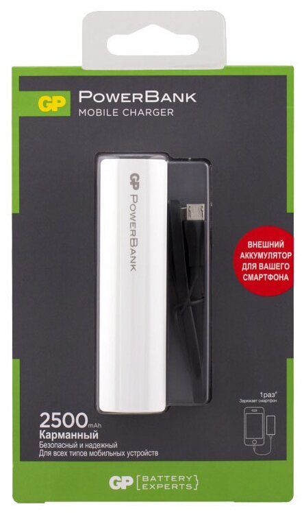 Capacity: 2500 mAh, max. output current: 1A, weight: 62g