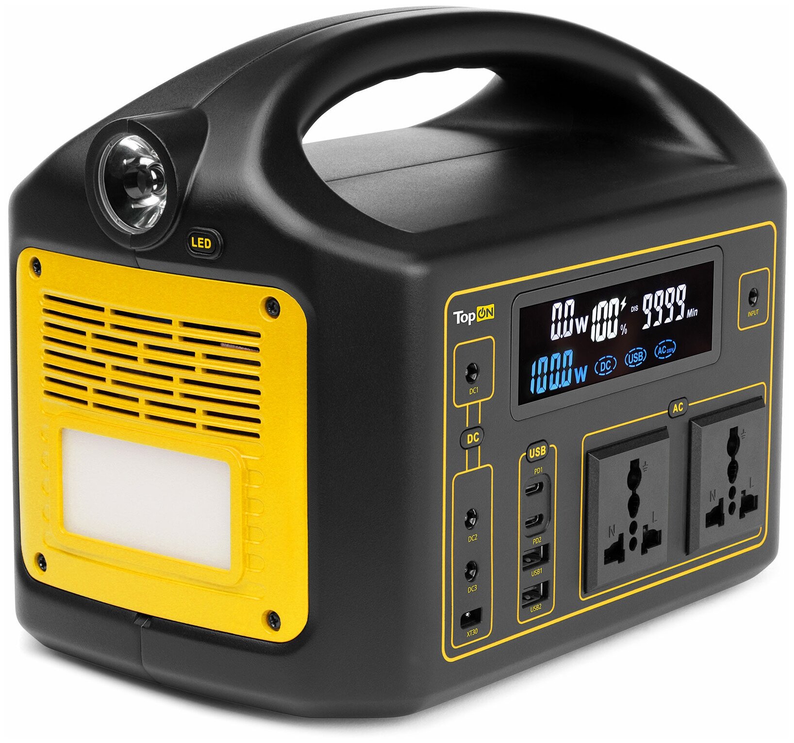 External battery TopON TOP-X220 160800 mAh, 2 sockets 220 V 300 W, 3 x DC 5-24 V 80 W, XT30, 2 x Type-C PD 60 W / 18 W, 2 x USB QC3.0, flashlight
