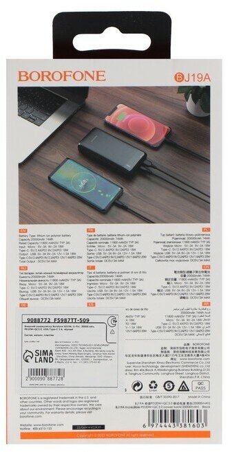 Capacity: 20000 mAh, compatibility: fast charging, laptop charging, For camcorder, For mobile phone, For watches, max. output current: 3A, weight: 400g