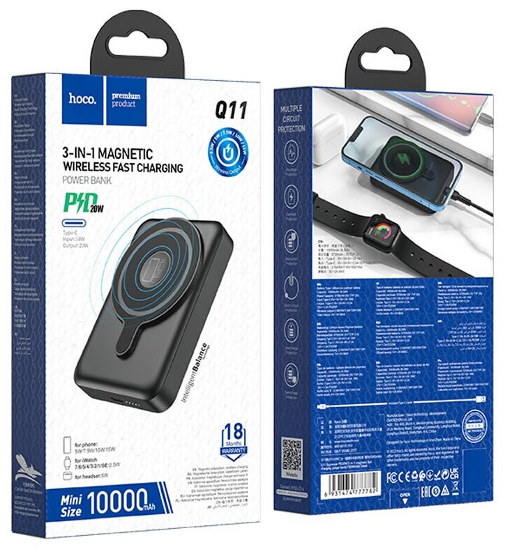 Capacity: 10000 mAh, compatibility: wireless charging, fast charging, charging for Apple Watch, universal, max. output current: 2A, weight: 200g