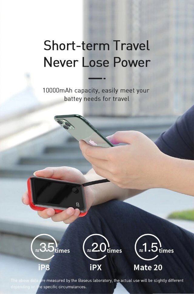 Capacity: 10000 mAh, compatibility: fast charging, universal, max. output current: 3A, features: dual device charging, charge indicator, display, laptop charging, weight: 202g