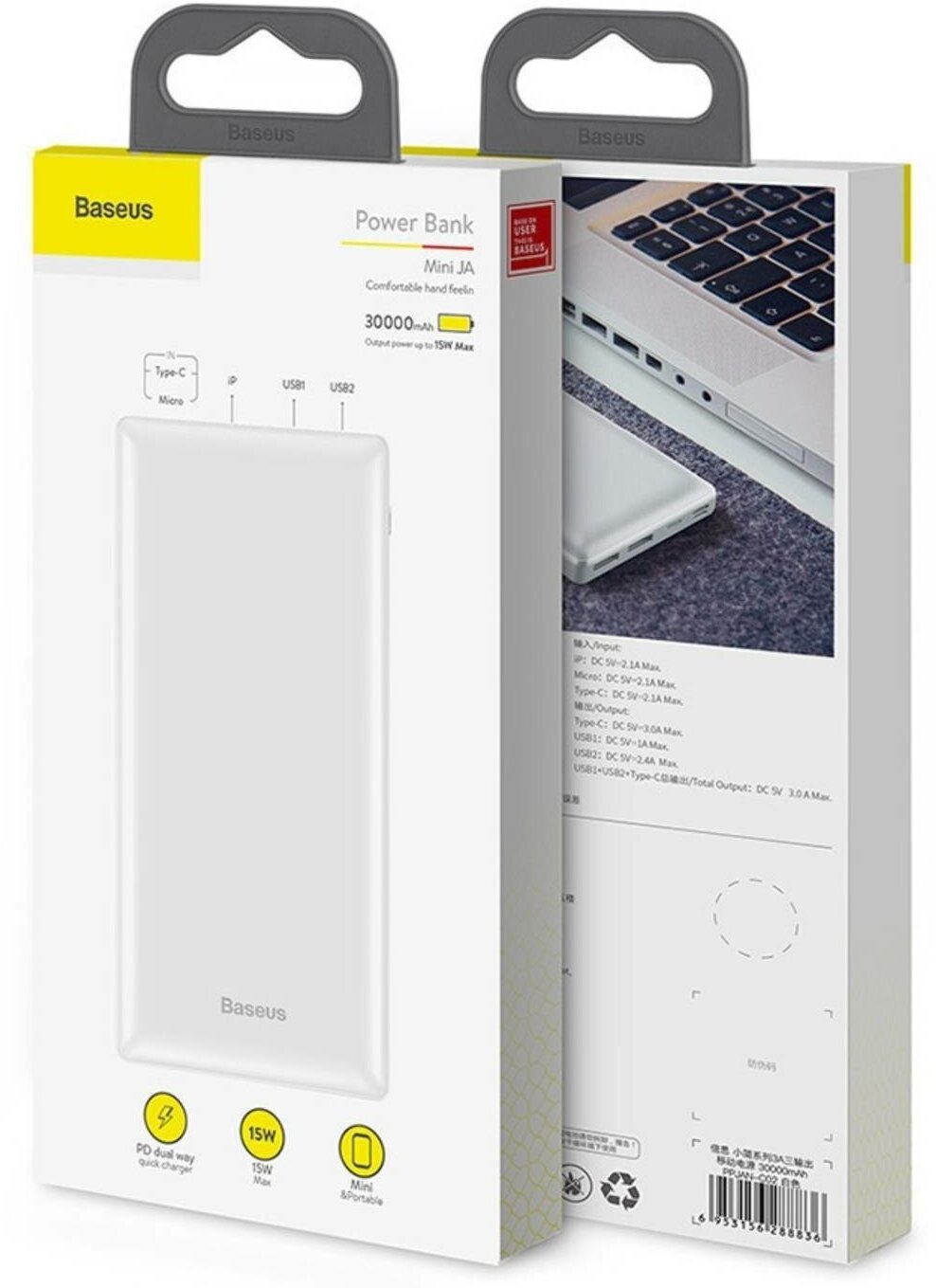 Capacity: 30000 mAh, compatibility: fast charging, universal, max. output current: 3A, features: dual device charging, charge indicator, Power Delivery fast charging, Quick Charge fast charging, laptop charging, weight: 622g