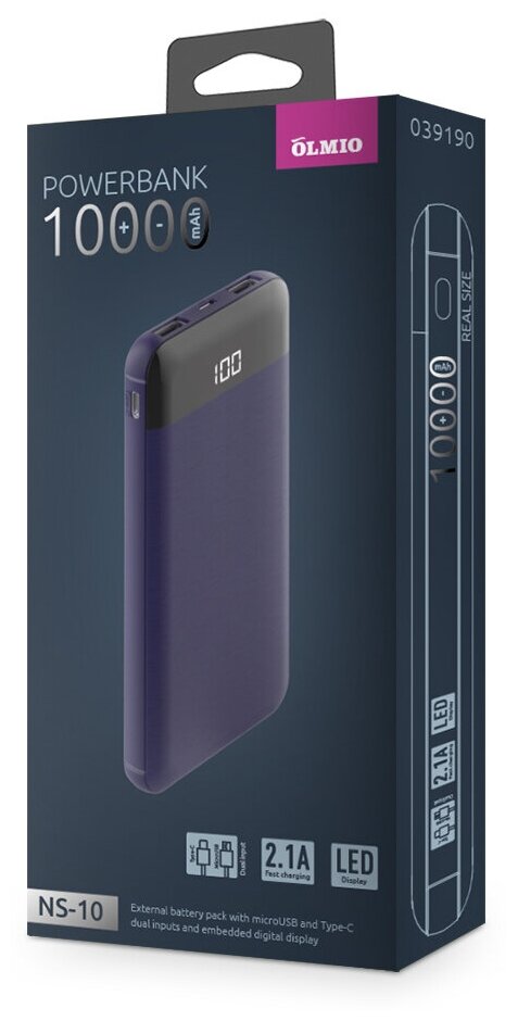 External battery NS-10, 10000mAh, 2.1A, LCD, dark blue, OLMIO