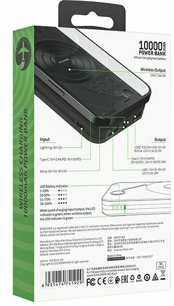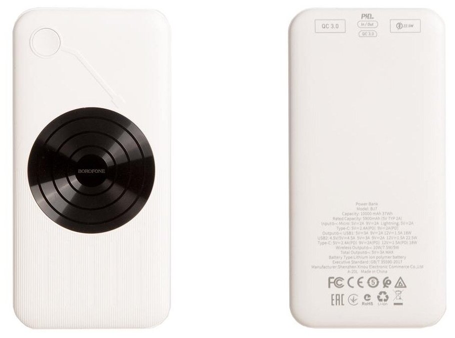 Capacity: 10000 mAh, compatibility: wireless charging, fast charging, for camcorder, for camera, universal, max. output current: 3A, features: dual device charging, weight: 232g