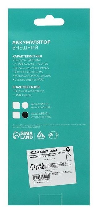 APPLIANCESS PB-01, 7200 mAh, 2 USB, 1/2.1 A, flashlight, white