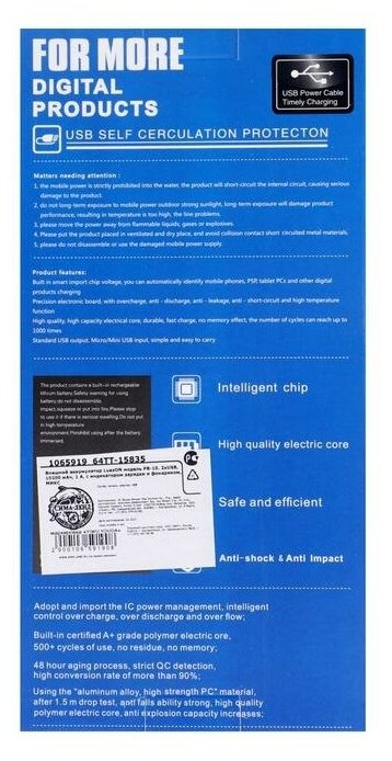 External LuazON PB-10, 10200 mAh, 2 USB, 1 A, charging indicator and flashlight, mix