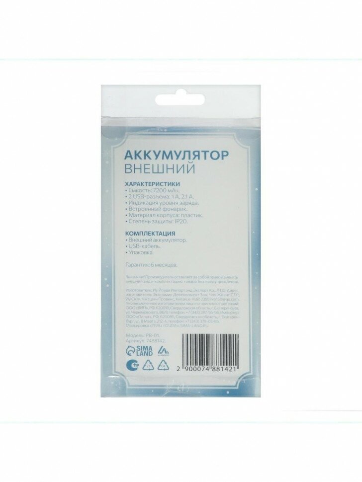 External LuazON PB-01 NY, 7200 mAh, 2 USB, 1/2.1 A, flashlight, white