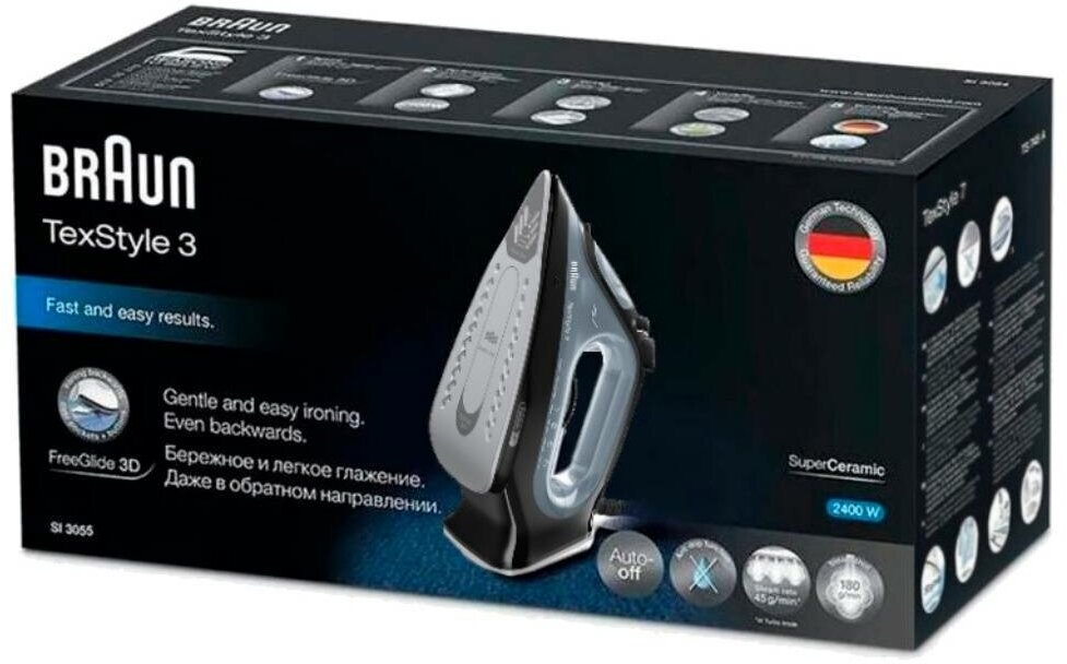 Soleplate material: ceramics, power: 2400 W, automatic switch-off, additional functions: steam boost, continuous steam supply, steam regulation, self-cleaning system, spray function, vertical