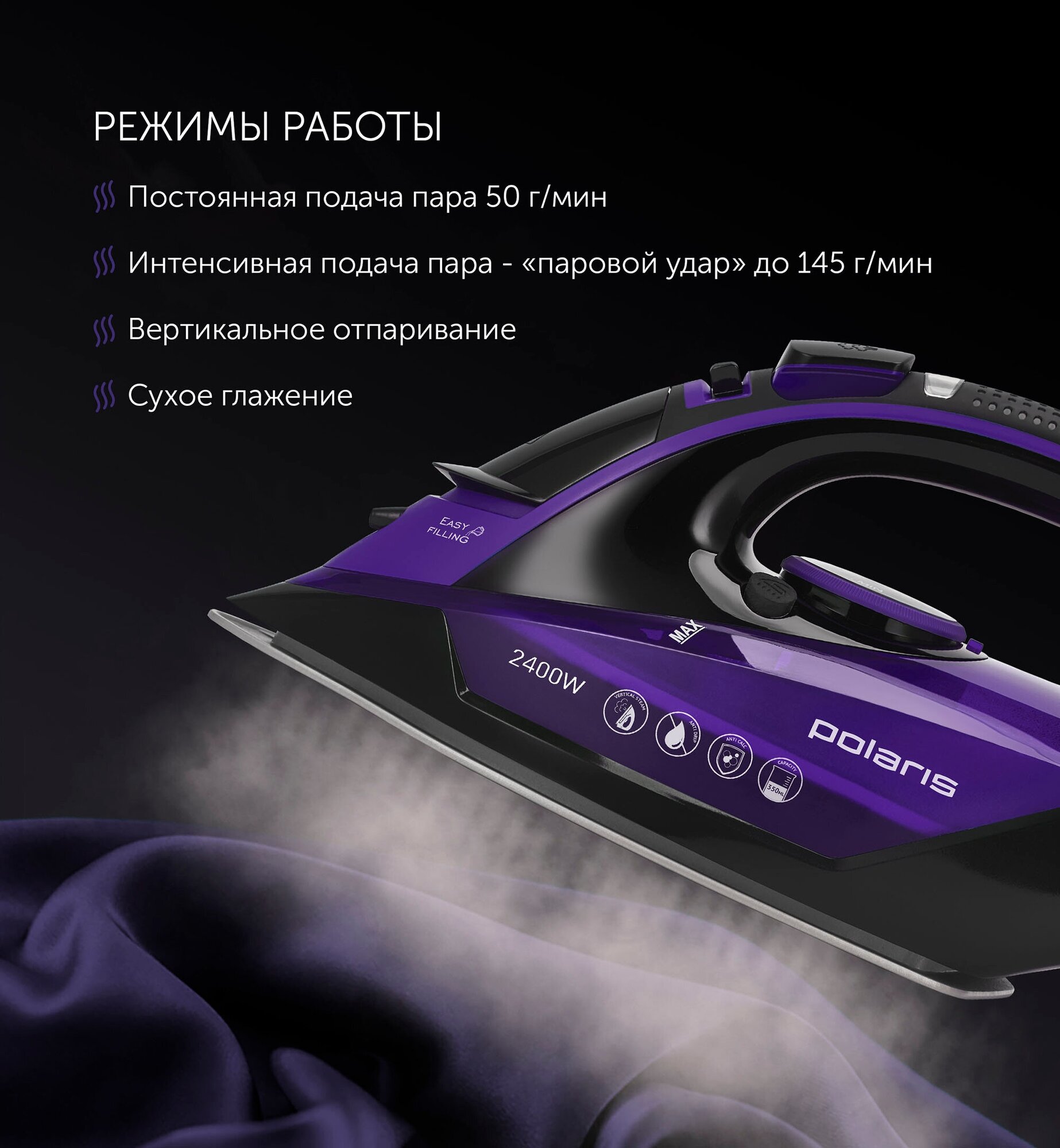 Sole material: ceramics, power: 2400 W, additional functions: steam boost, constant steam supply, steam supply regulation, temperature regulation, self-cleaning system, dry ironing, spray function, ve