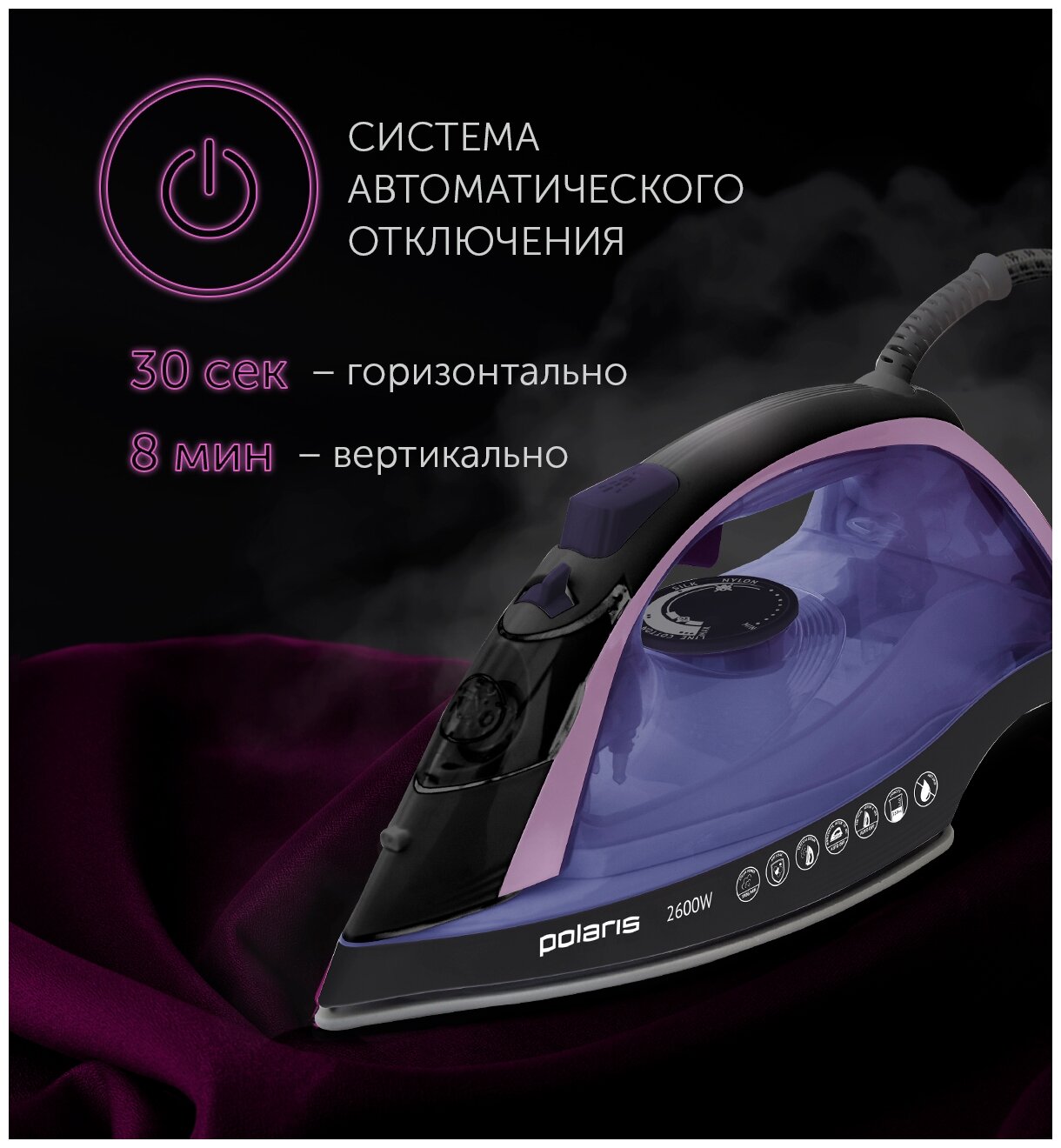 Sole material: ceramics, power: 2600 W, automatic switch-off, additional functions: steam boost, constant steam supply, steam regulation, self-cleaning system, spray function, vertical