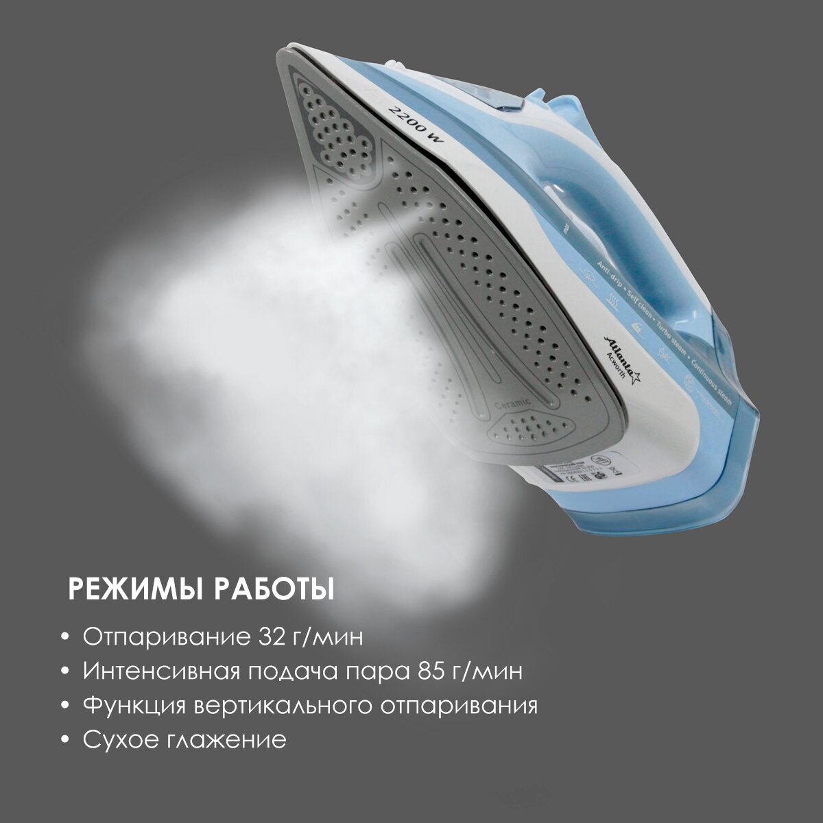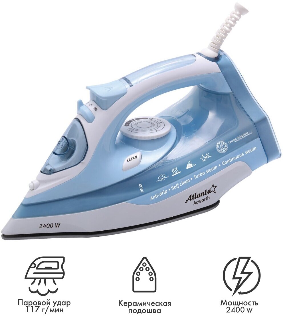 Sole material: ceramic, power: 2200 W, additional functions: steam boost, constant steam supply, self-cleaning system, dry ironing, spray function, vertical steaming, special features: ball fastening