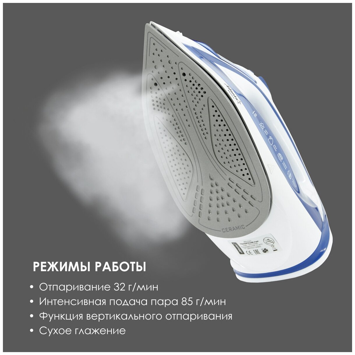 Sole material: ceramic, power: 2200 W, additional functions: steam boost, constant steam supply, self-cleaning system, dry ironing, spray function, vertical steaming, special features: ball fastening