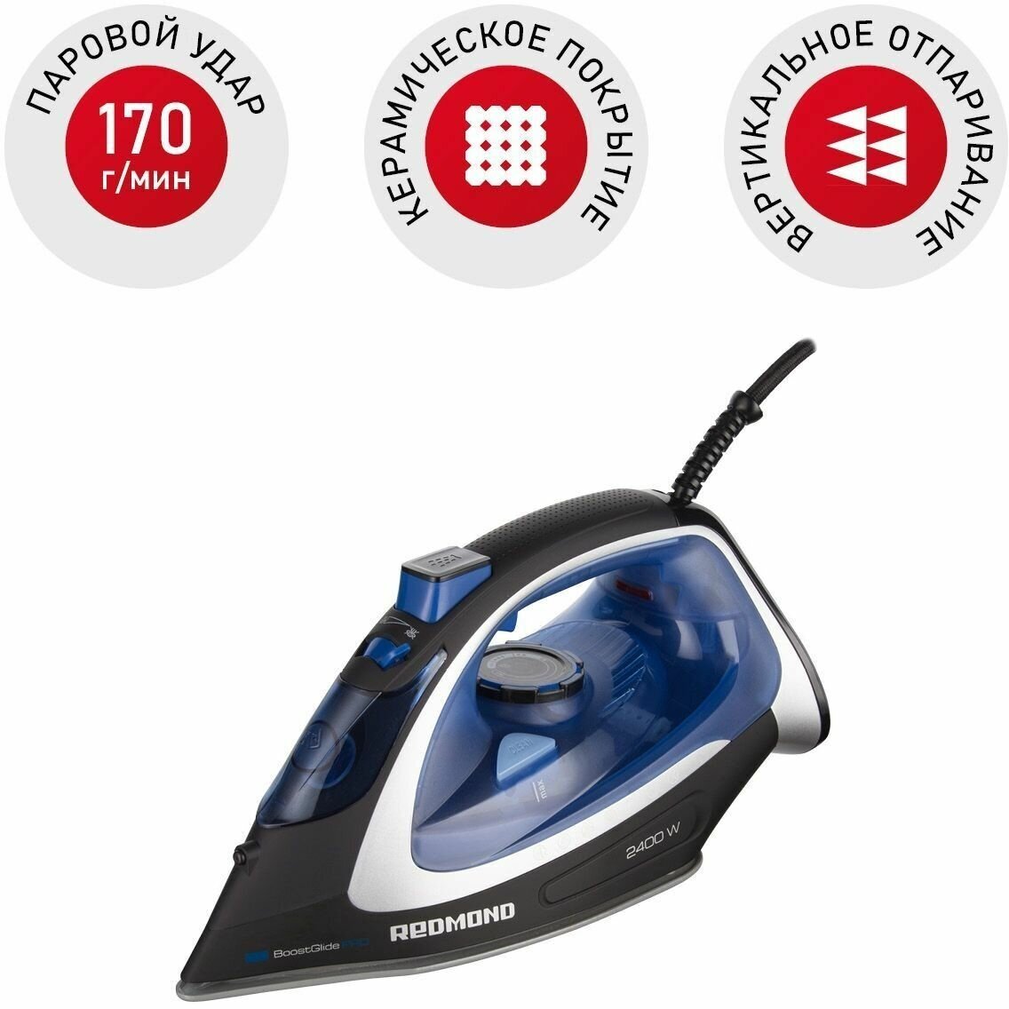 Soleplate material: ceramics, power: 2400 W, automatic switch-off, additional functions: steam boost, continuous steam supply, steam regulation, self-cleaning system, spray function, vertical