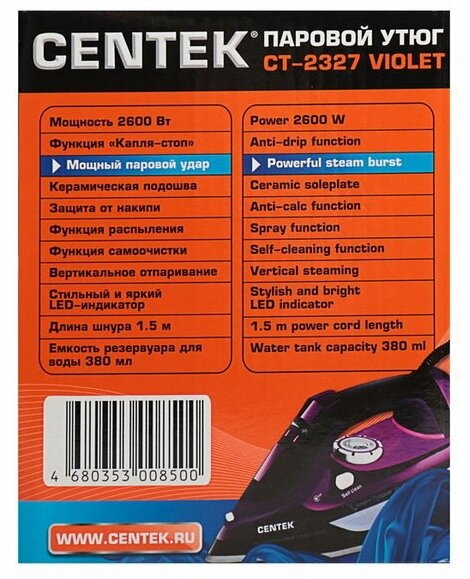 Sole material: ceramics, power: 2600 W, automatic switch-off, additional functions: steam boost, constant steam supply, steam regulation, self-cleaning system, spray function, vertical