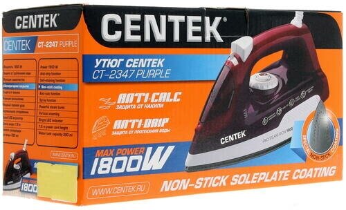 Sole material: Teflon, power: 1800 W, additional functions: steam boost, constant steam supply, steam supply adjustment, self-cleaning system, spray function, anti-calc, vertical steam,