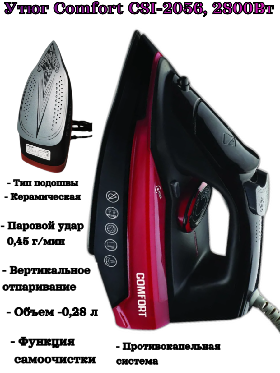 Automatic steam regulation, steam boost, constant steam supply, steam supply regulation, temperature regulation, auto-off signal, self-cleaning system, dry ironing, spray function, anti-scaling