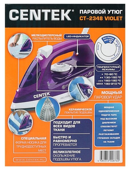 Sole material: ceramic, power: 2200 W, additional functions: steam boost, constant steam supply, self-cleaning system, dry ironing, spray function, vertical steaming, special features: ball fastening