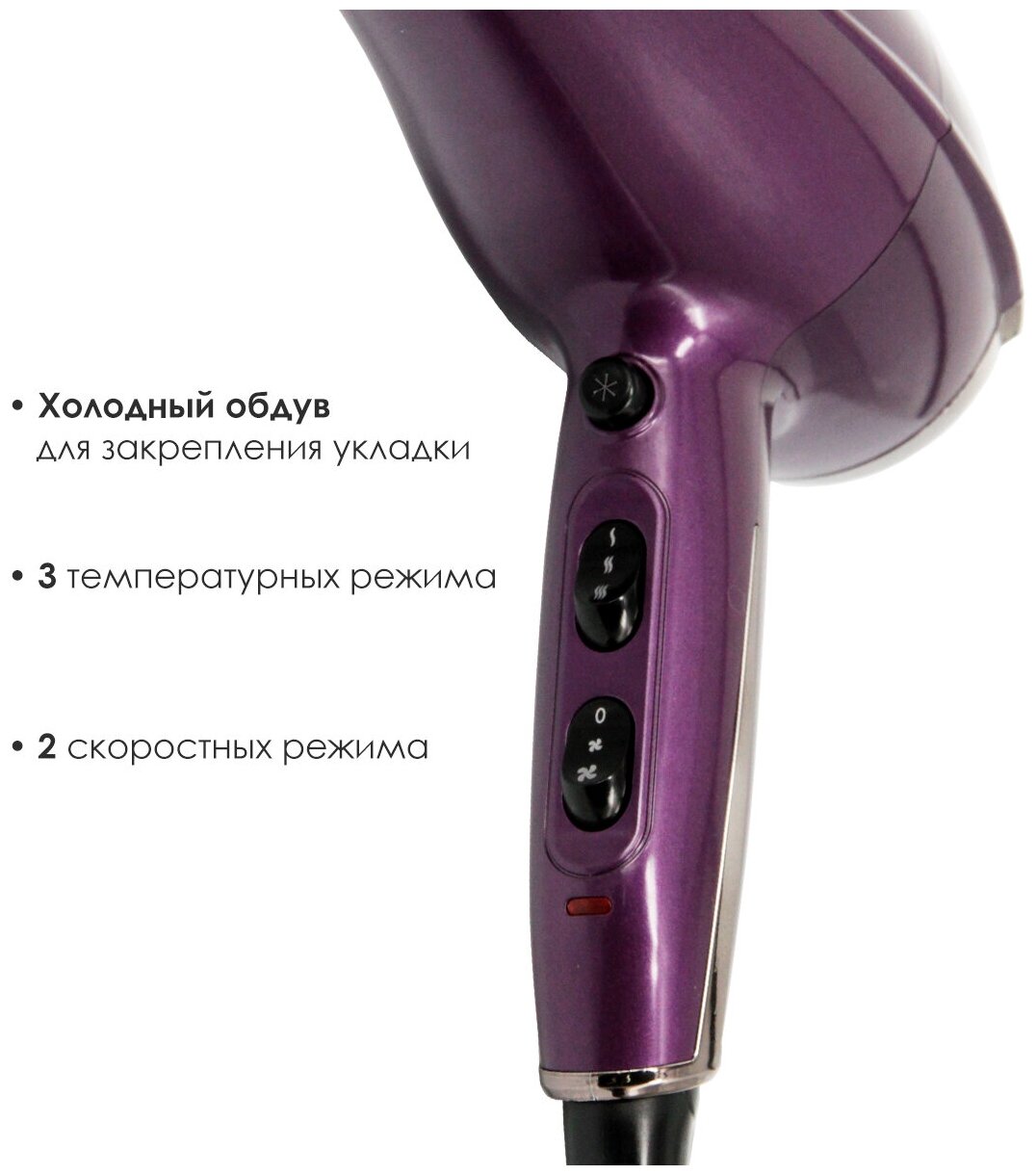 Type: hair dryer, accessory type: diffuser, hair dryer power: 2200 W, additional functions: ionization, independent adjustment of heating and air flow, cold air supply, nozzles: diffuser, concentrator, number of dir