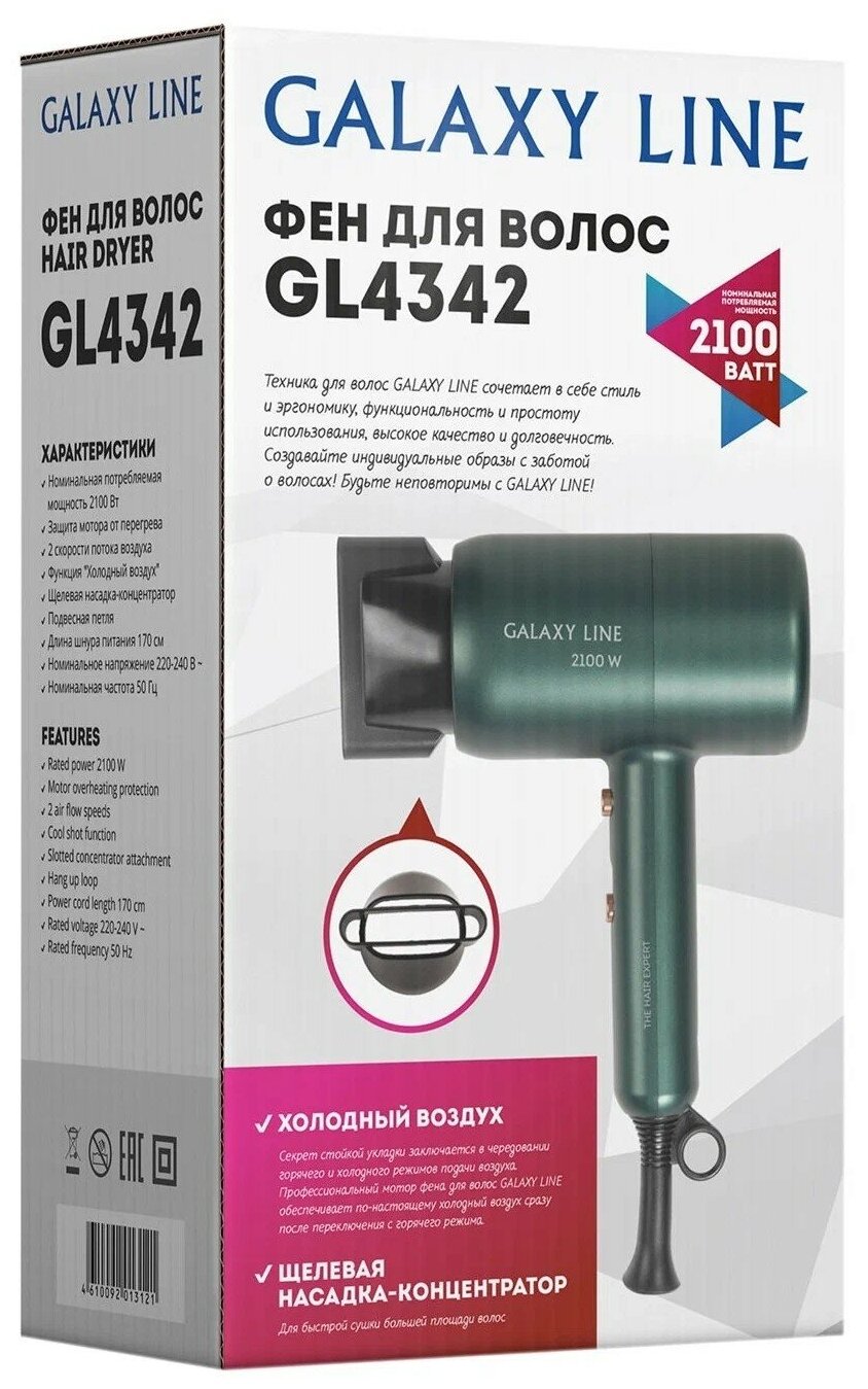 Type: hair dryer, hair dryer power: 2200 W, additional functions: ionization, independent adjustment of heating and air flow, cold air supply, attachments: diffuser, concentrator, number of heating modes: 3, quantity