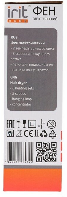 Type: hair dryer, hair dryer power: 2200 W, additional functions: ionization, independent adjustment of heating and air flow, cold air supply, attachments: diffuser, concentrator, number of heating modes: 3, quantity