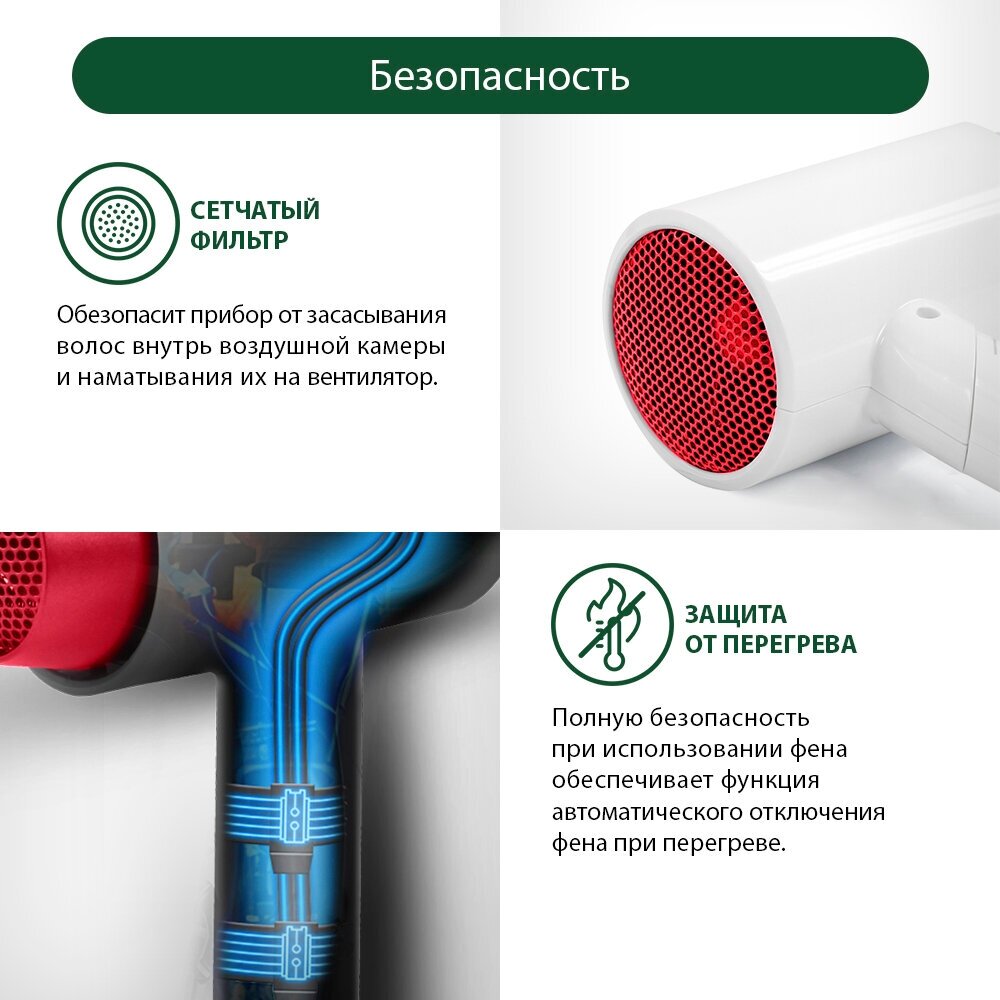 Type: hair dryer, hair dryer power: 2200 W, additional functions: ionization, independent adjustment of heating and air flow, cold air supply, attachments: diffuser, concentrator, number of heating modes: 3, quantity