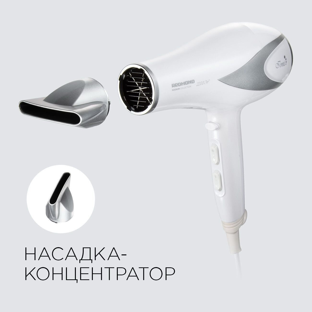 Type: hair dryer, hair dryer power: 2200 W, additional functions: cold air supply, Ionization, 3 temperature blows, 2 blowing speeds, Motor type - DC, Overheat shutdown, nozzles: concentrator, number of speeds: 2