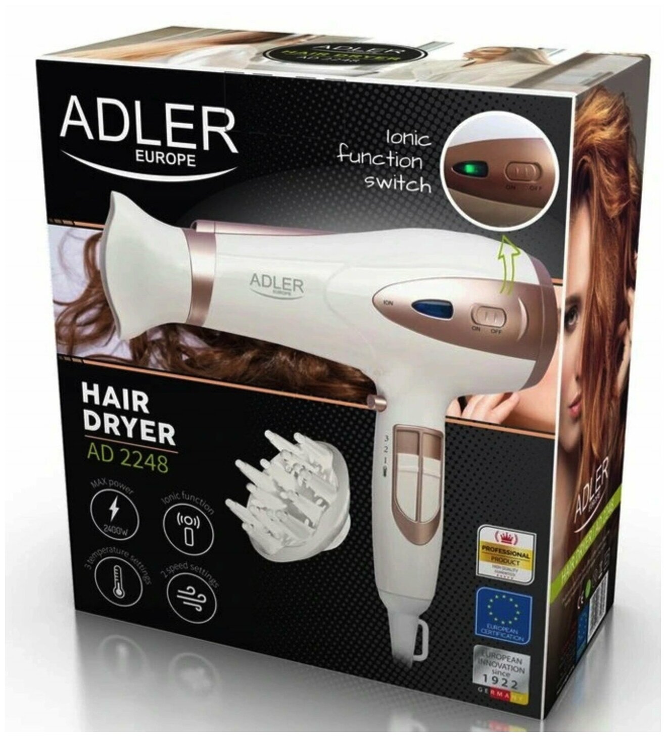 Type: hair dryer, hair dryer power: 2400 W, additional functions: ionization, cold air supply, nozzles: diffuser, number of speeds: 2, weight: 800 g