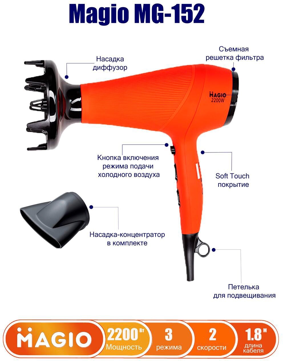 Description: Type: hair dryer, hair dryer power: 2000 W, additional functions: independent adjustment of heating and air flow, cold air supply, attachments: concentrator, number of speeds: 2