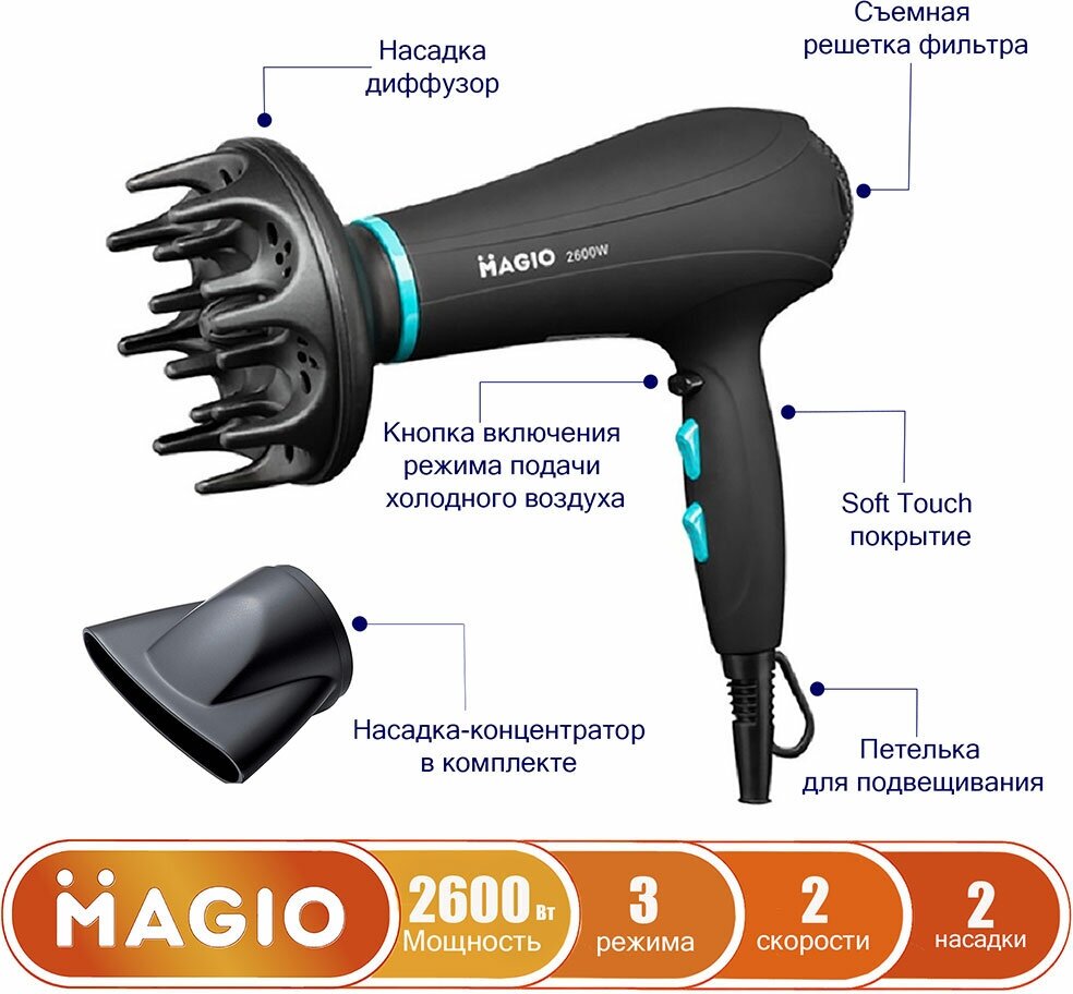 Type: hair dryer, hair dryer power: 2600 W, additional functions: independent adjustment of heating and air flow, cold air supply, attachments: diffuser, concentrator, number of speeds: 2