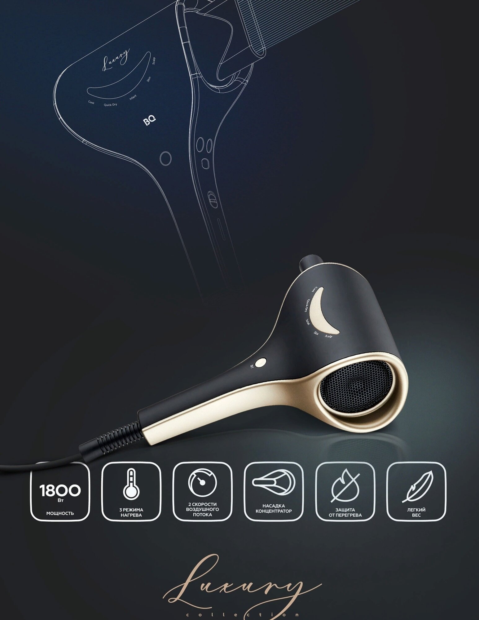 Description: Type: hair dryer, hair dryer power: 1800 W, additional functions: ionization, independent adjustment of heating and air flow, cold air supply, attachments: concentrator, number of speeds: 2, power cord length: 1.80 m,