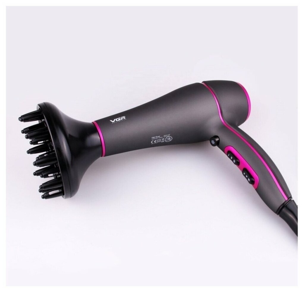 Type: hair dryer, hair dryer power: 2200 W, additional functions: cold air supply, nozzles: diffuser, concentrator, number of speeds: 2, brush material: plastic, brush nozzle diameter: 50 mm, power cord length: 3 m, weight: