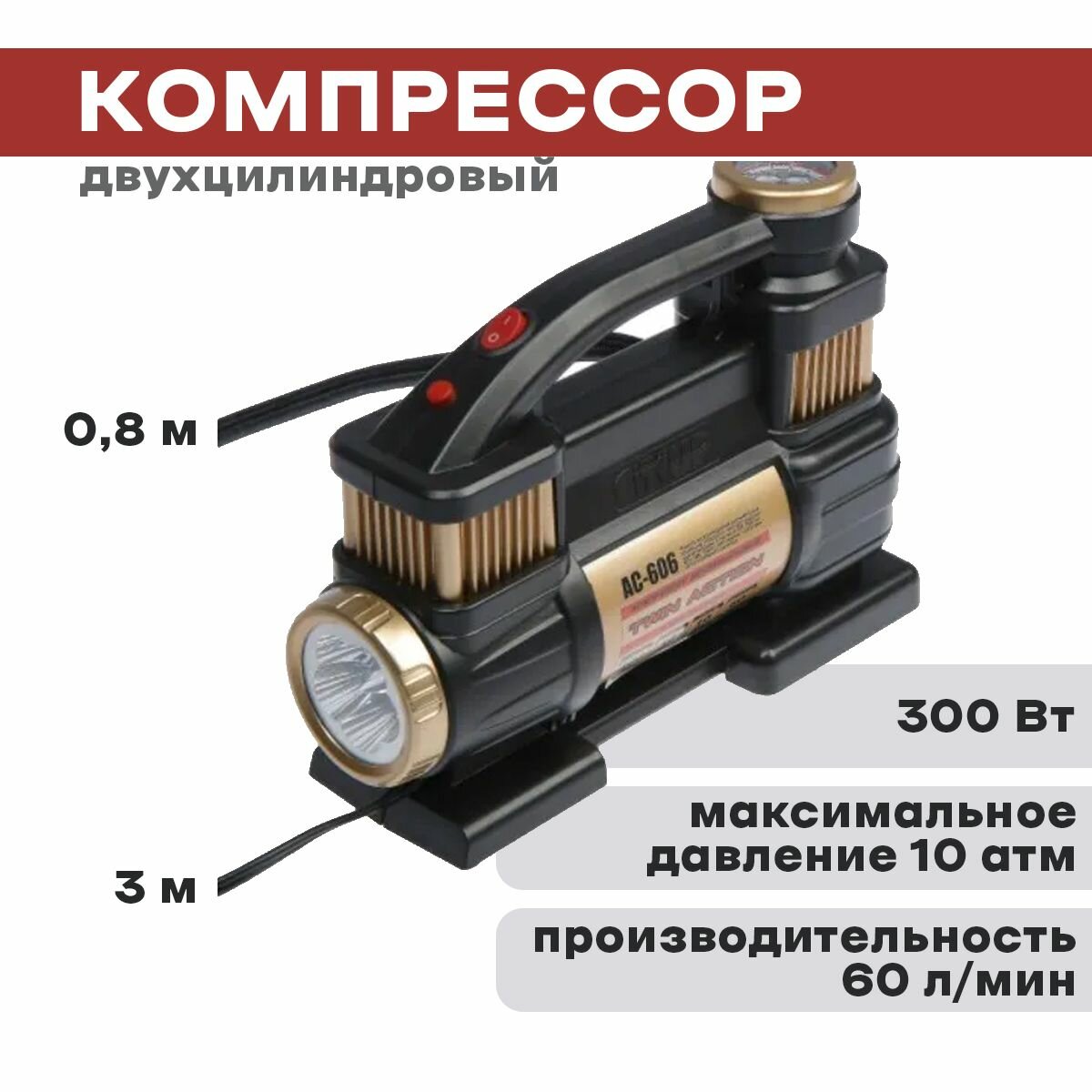 Power: from the cigarette lighter socket, from the battery terminals, from the car network 12V, voltage: 12 V, input capacity: 60 l/min, power: 300 W, maximum pressure: 10 atm, compressor type: piston, cable length