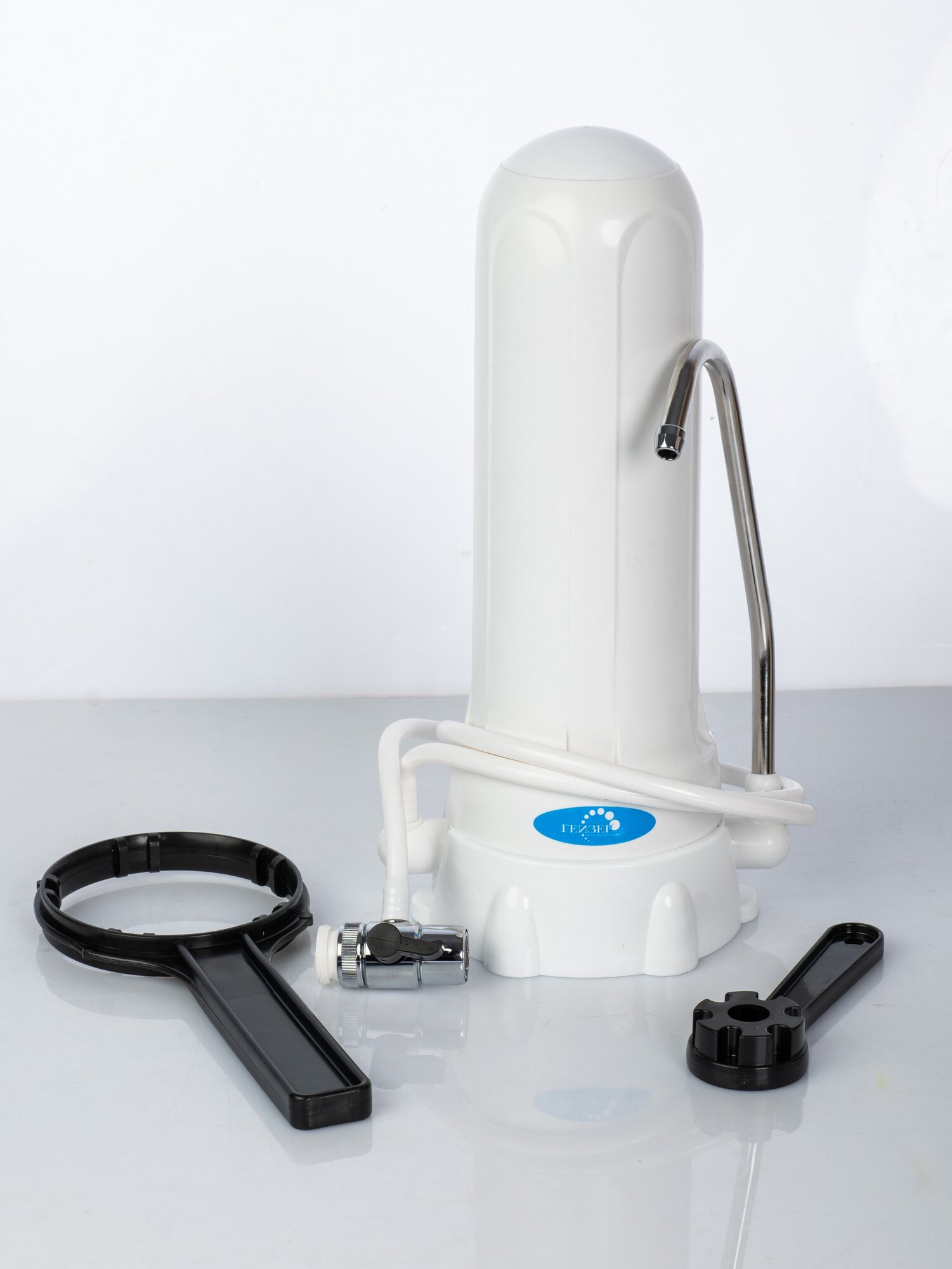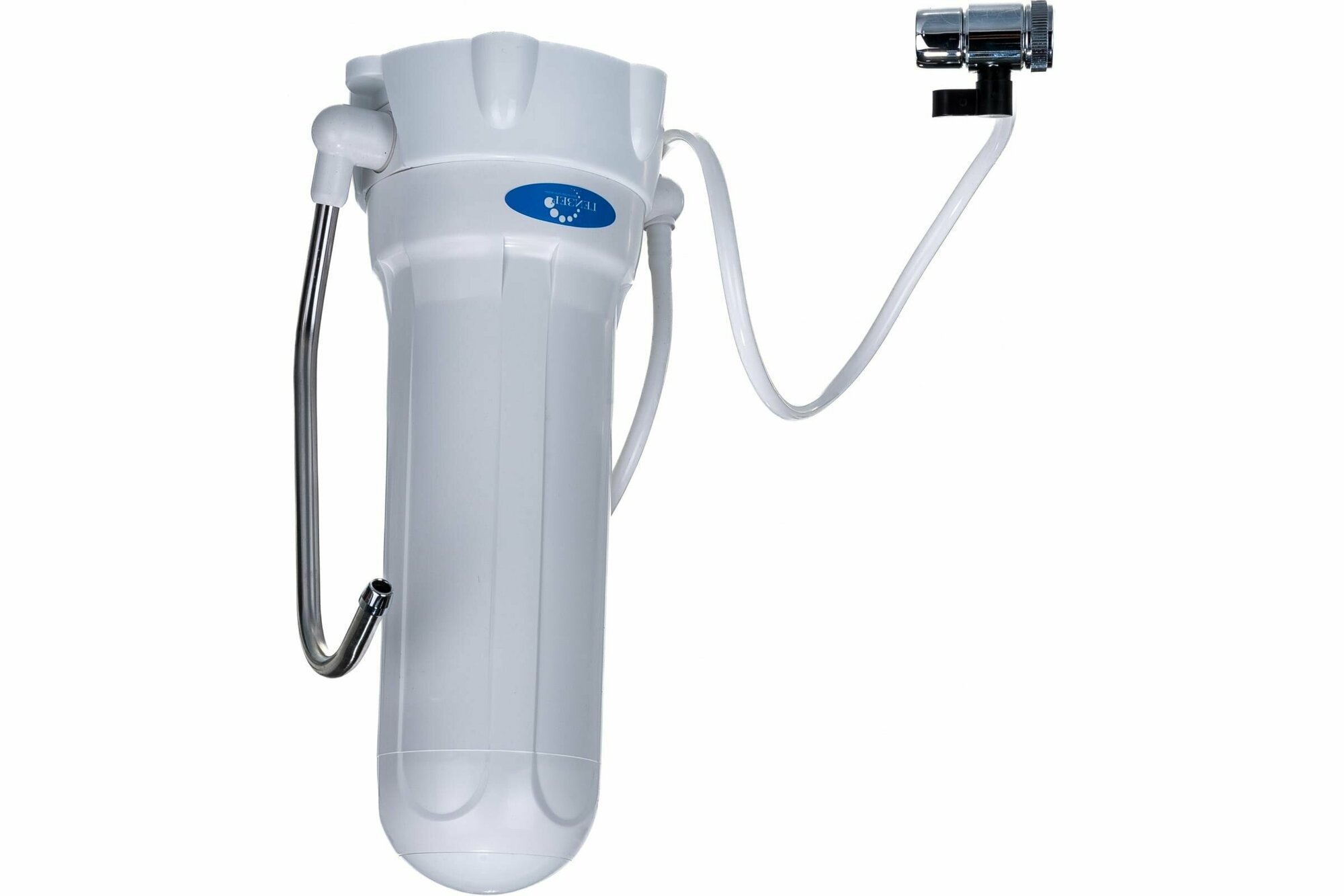 For hard water; connects to a tap with a thread through a diverter, by turning the switch the water is directed to filtration or to the sink