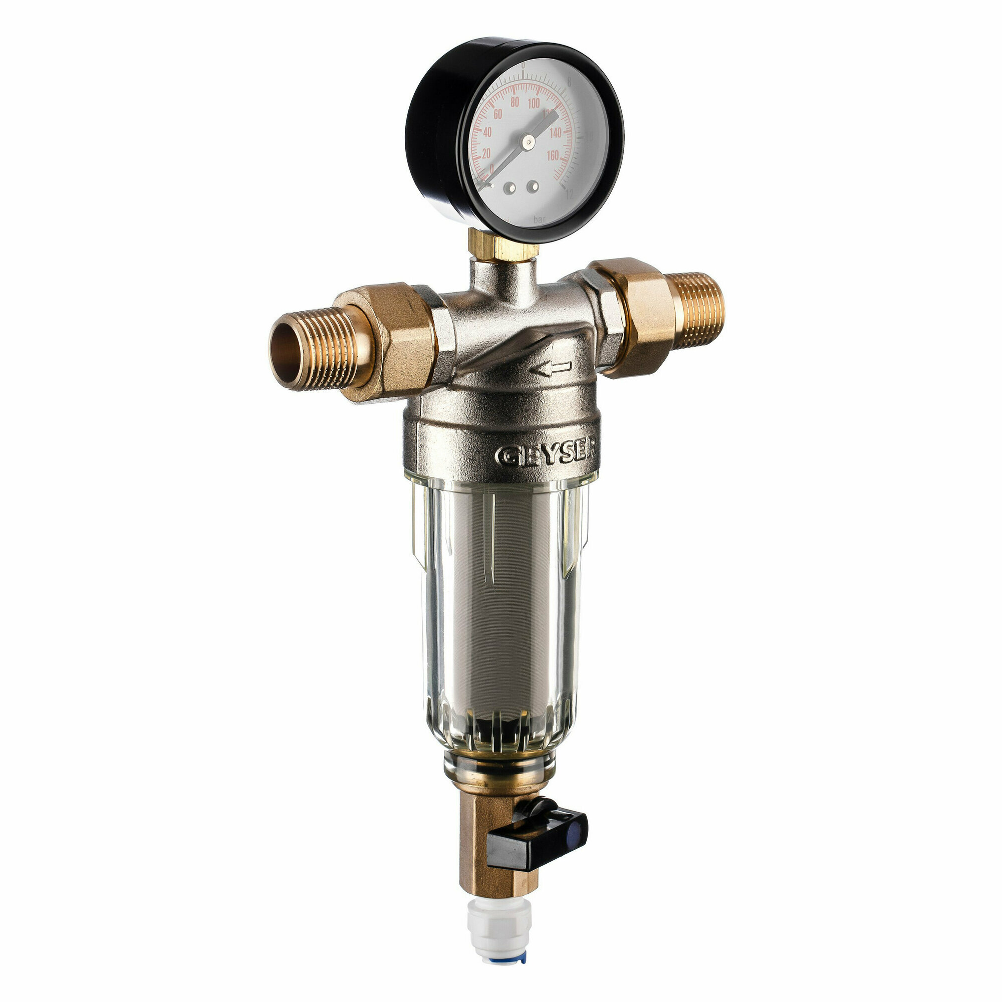 Body material: PVC, connection type: union male/male, mesh size: 90 µm, options: pressure gauge, drain
