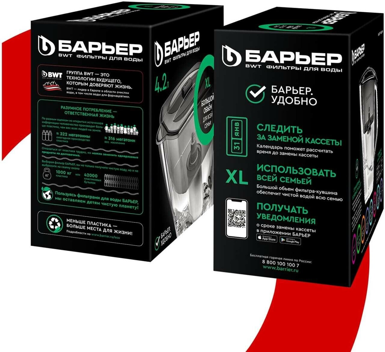 Volume of filtered water: 2 l; funnel volume: 1.7 l; compatible with all interchangeable cassettes Barrier; delivery of different configuration options is acceptable - with a “standard” cassette or a “rigidity” cassette
