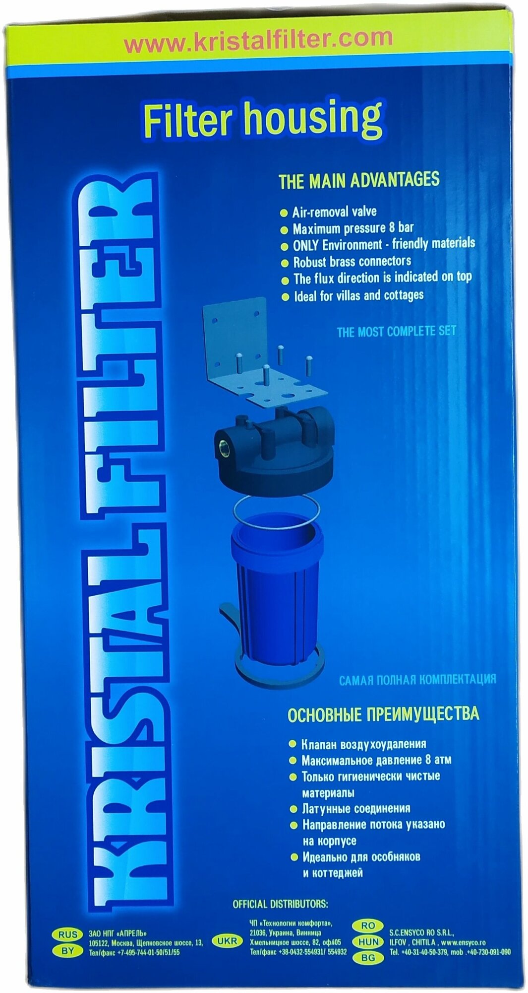Material of the case and a glass of the filter - polypropylene; compatible 10 BB cartridge not included; equipment: flask, key, wall mount, bolts, instruction, box, package