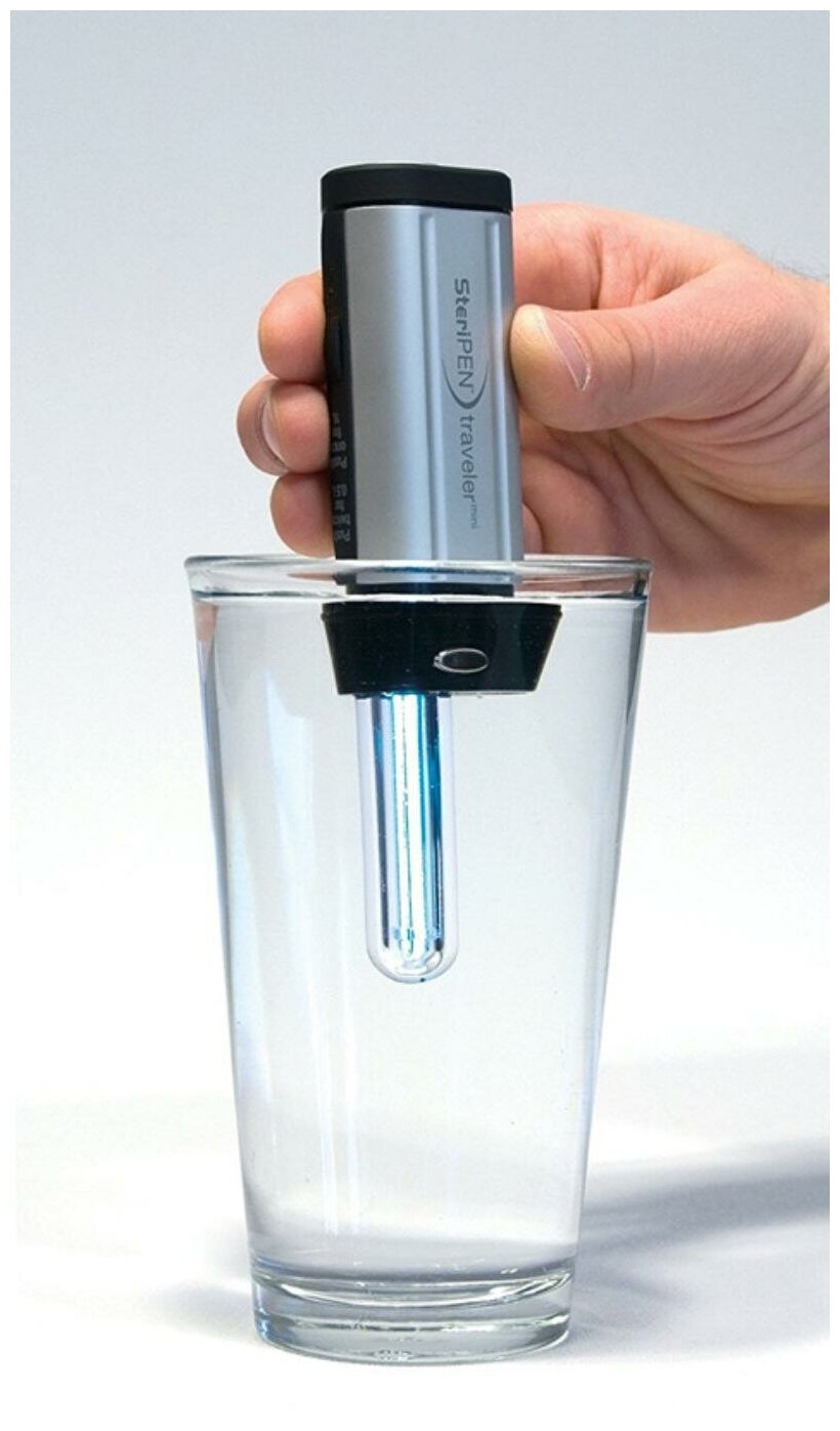 Portable decontaminator; clears 0.5 liters in 48 seconds; package contents: 2 batteries, nylon case and user manual