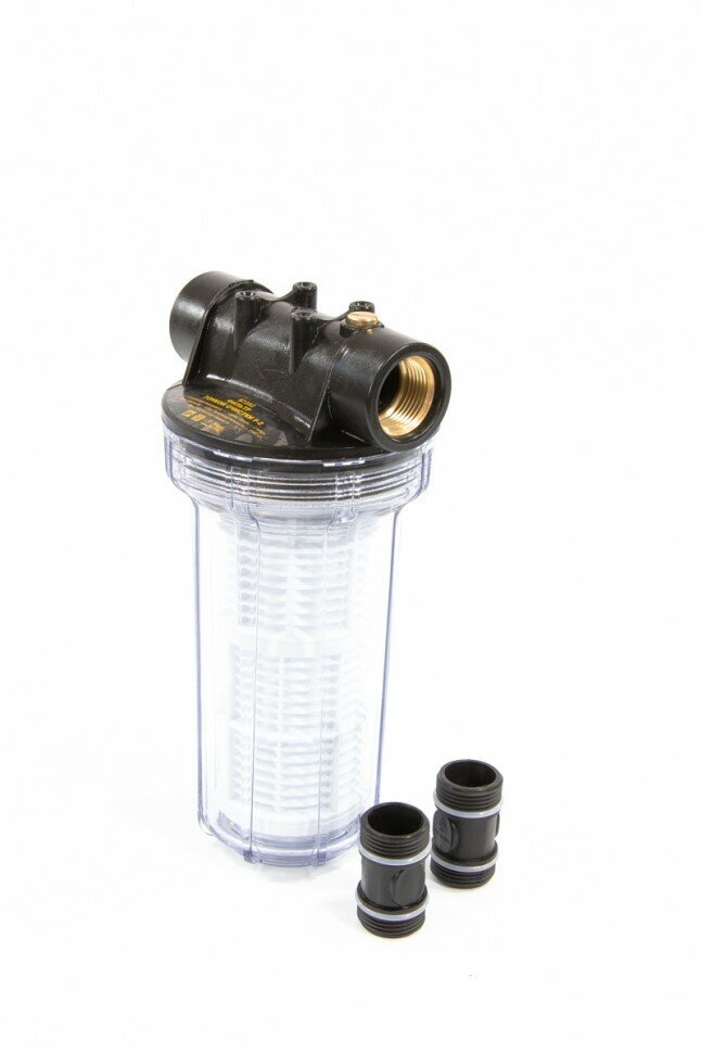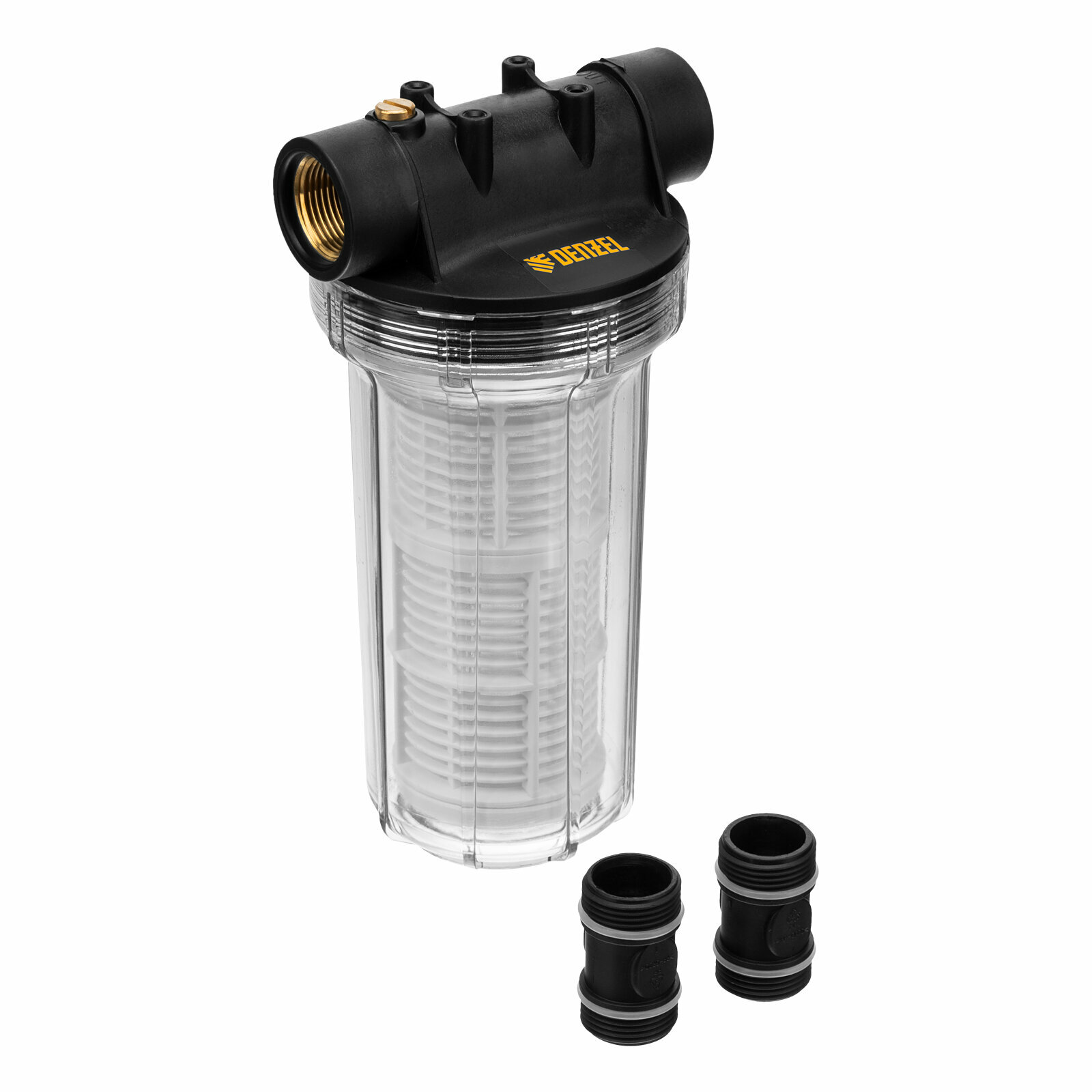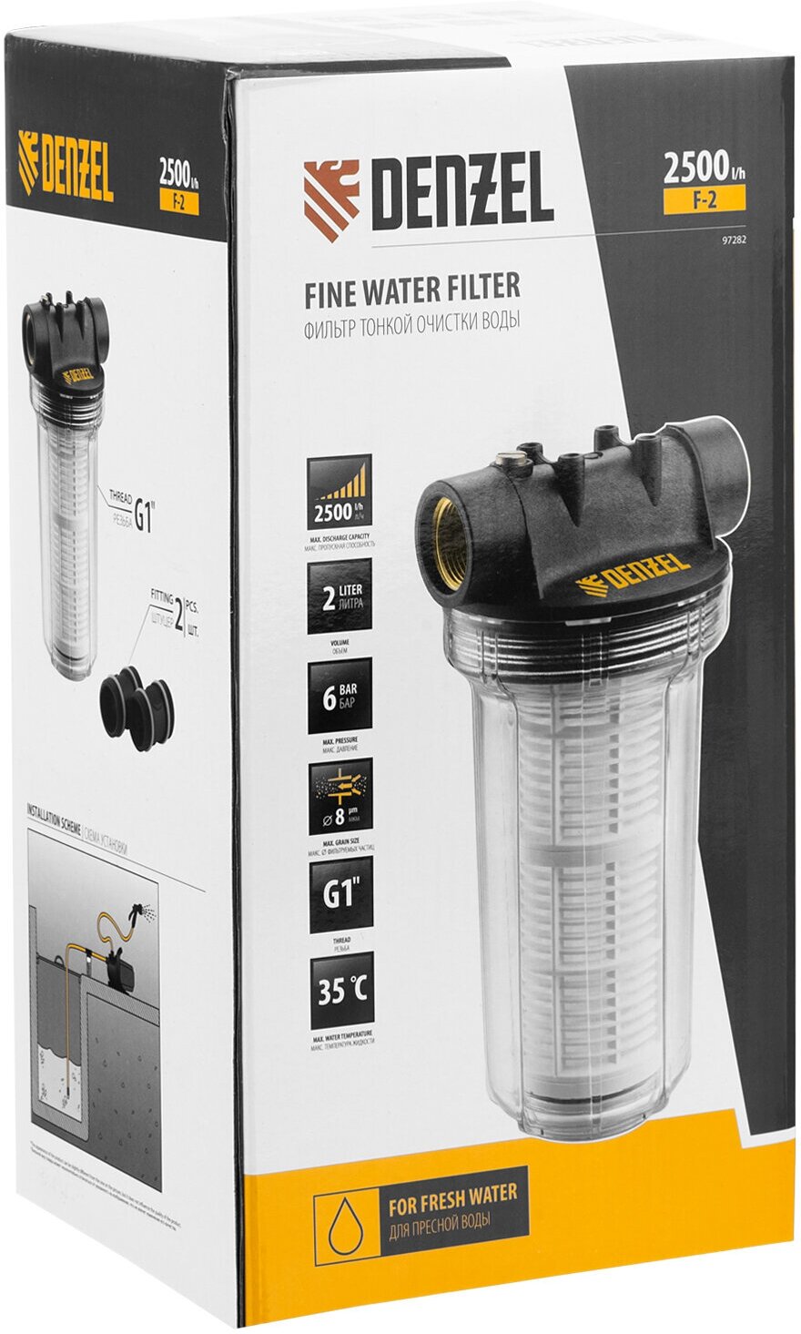 Productivity: 2500 l/h; filtered particle size: 8 microns; material: plastic; recommended productivity: 41.67 l/min; filter - 1 pc; adapters - 1 pc; instruction manual - 1 pc
