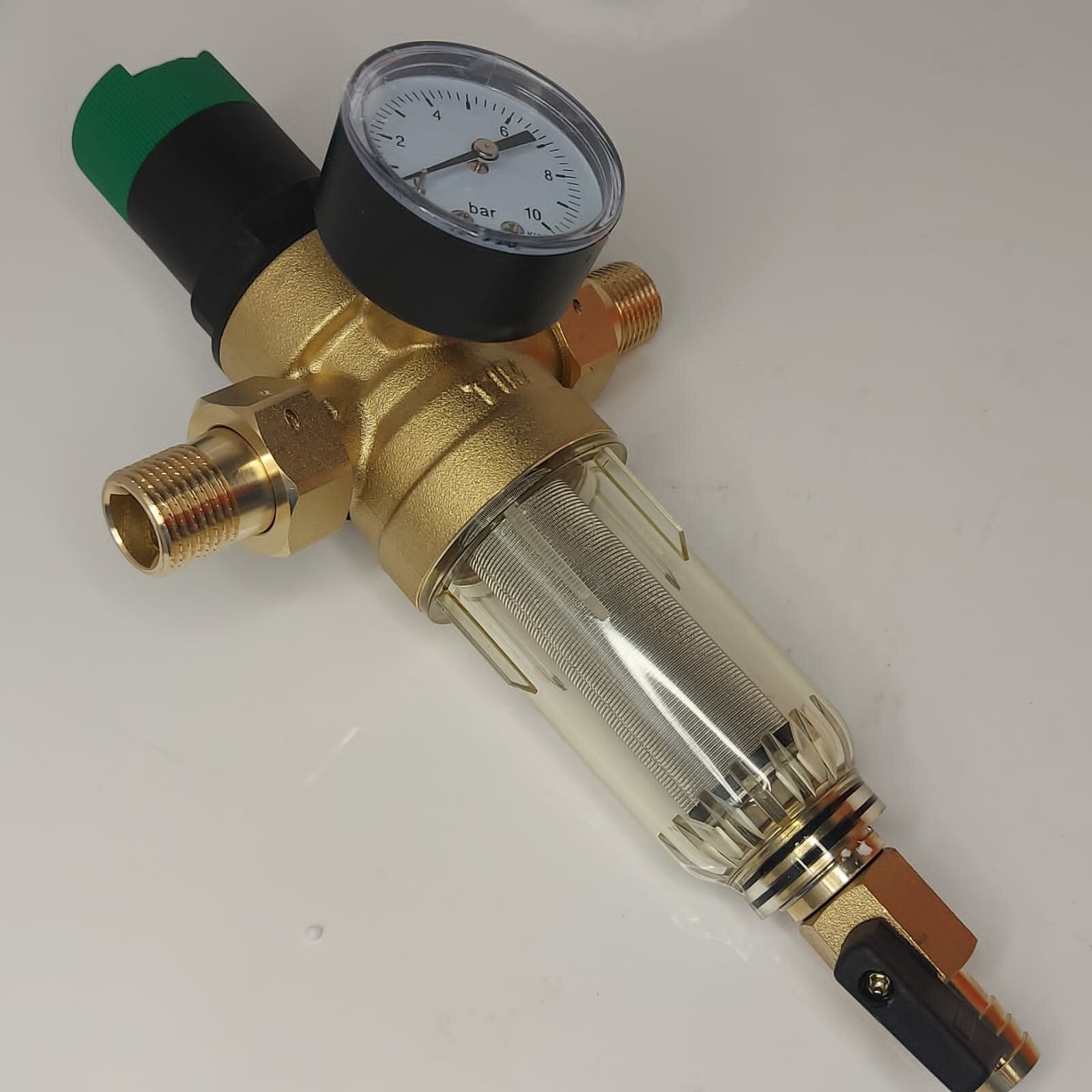 Connecting size 1/2"; nominal diameter G 3/4; self-cleaning filter, with pressure reducer and glass body, with pressure gauge, Americans and drain cock with fitting