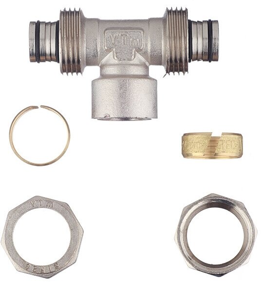 Type: tee, connection type: crimp - thread, connection: female, thread diameter: ¾", pipe diameter: 26 mm, pipe thickness: 3 mm, material: brass, split, with union nut, with seal, combined