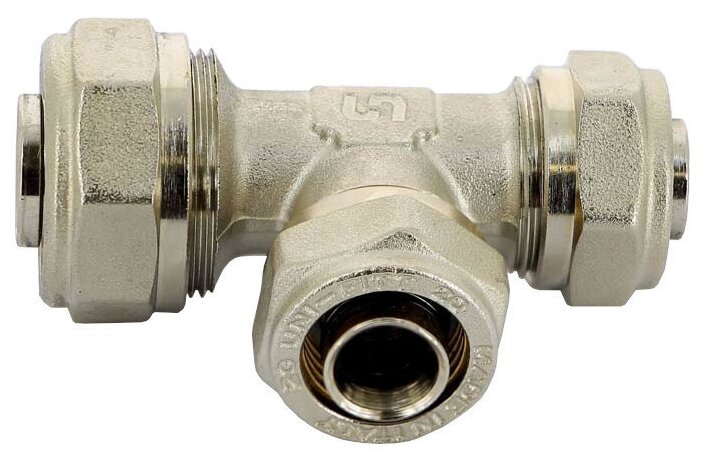 Type: tee, connection type: collet crimp, pipe diameter: 20 mm, 26 mm, pipe thickness: 2 mm, 3 mm, material: nickel-plated brass, adapter, split, with union nut, with seal