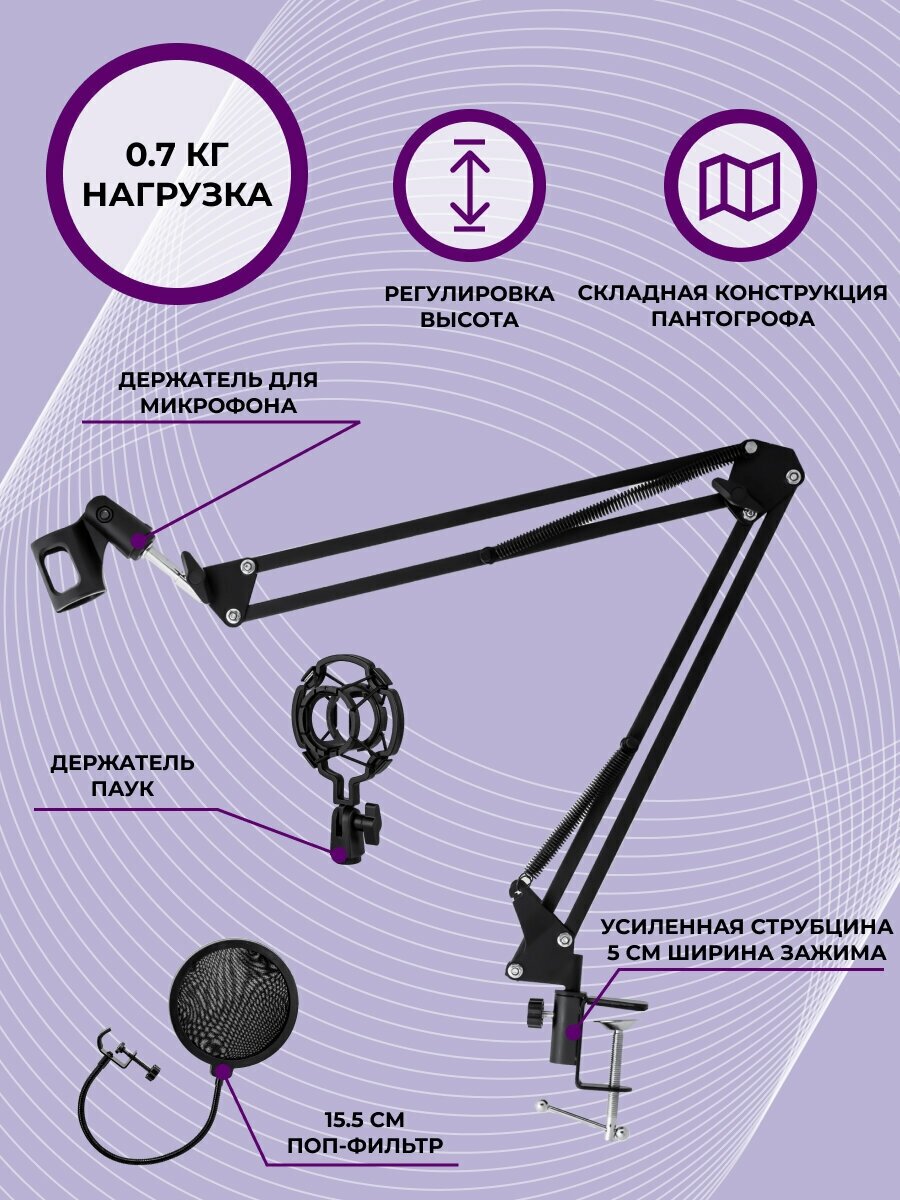 Type: microphone stand, installation: desktop, purpose: for sound recording, adjustment: height, angle, material: metal