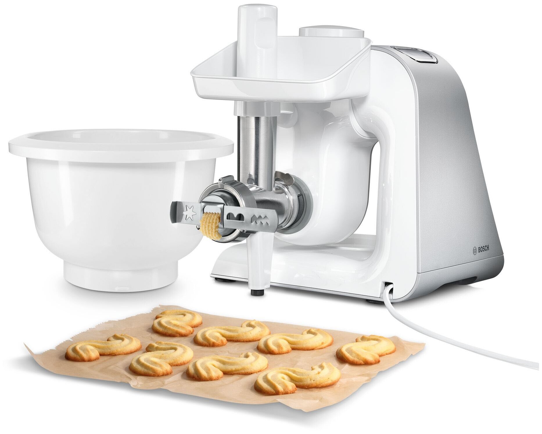 Type: loading tray, nozzle, knife, pusher, bowl, purpose: for minced meat, device type: food processor, device manufacturer: Bosch, set, material: metal, plastic