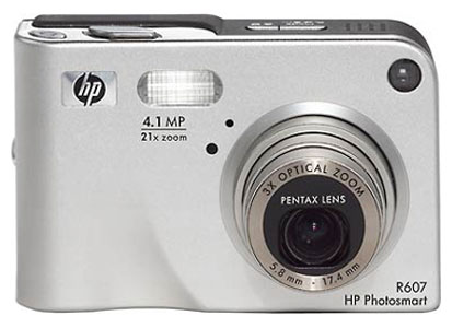 HP Photosmart R607 camera, Li-ion battery, AC adapter, USB cable, strap, CD-ROM with software, manual